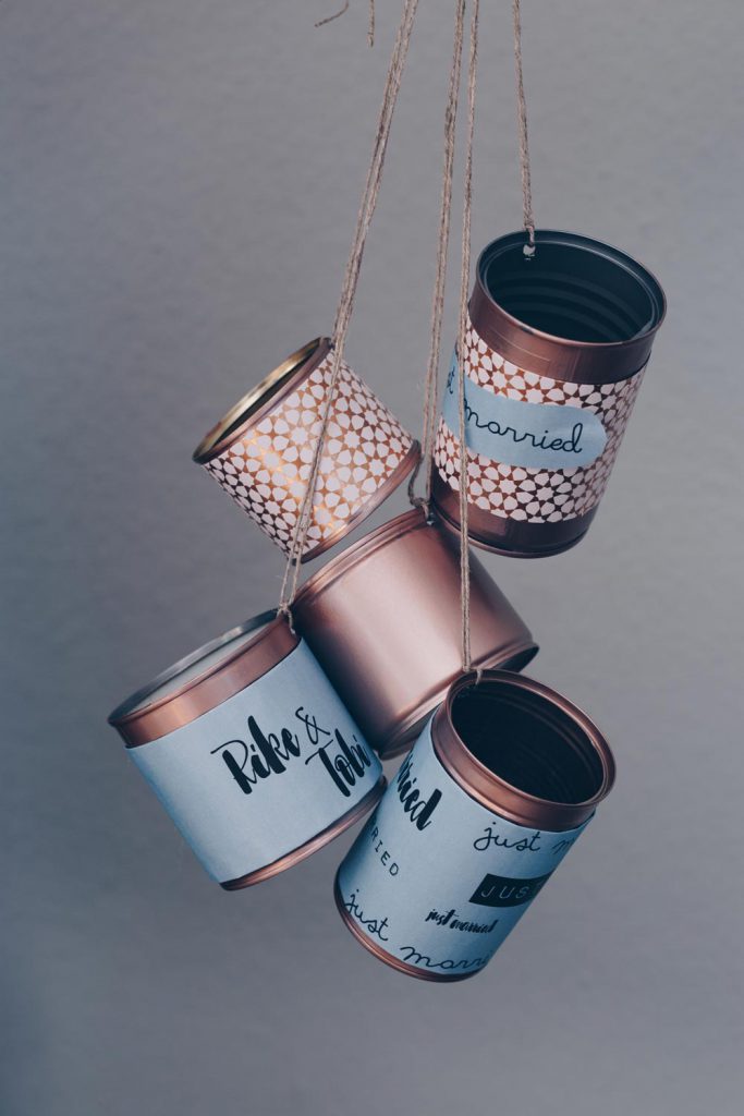 A nice little surprise for the wedding is DIY car decoration. I simply sprayed cans in one of my favorite spray paint colors and then wrapped them with banderoles and matching paper.
