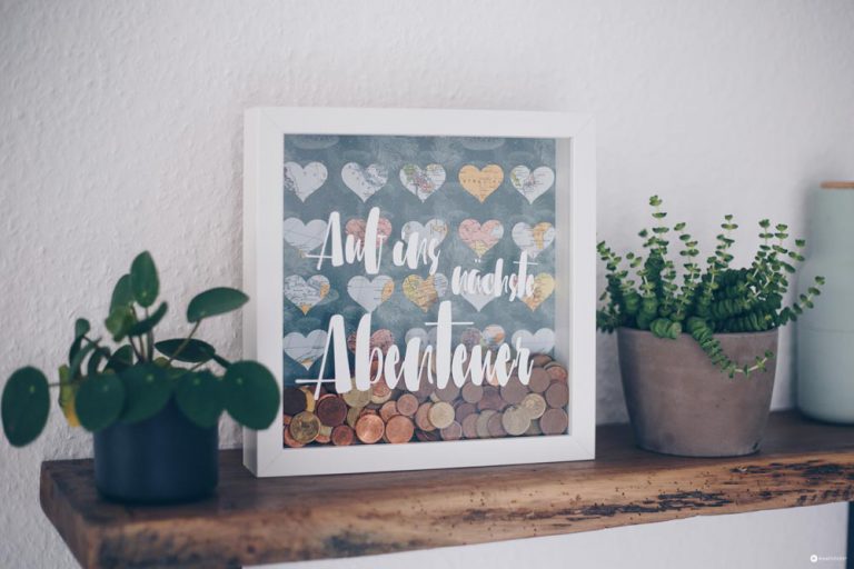 I made the nice cash gift Let’s start my new adventure out of nice construction paper, my plotter with vinyl foil and a deep picture frame from Ikea. I recently ordered the frames online so that I have them in stock for spontaneous gifts, because parcel shipping has become significantly cheaper in the meantime! I made a small slit in the top of the frame so you can insert money and also use the frame as a piggy bank if you wish. If you don’t have a plotter, you can also easily use a touch-up pen for the DIY.