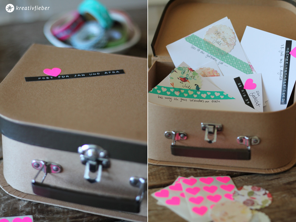 52 mottos for 52 postcards = personal mail every week for the wedding couple in their first year of marriage. In our postcard wedding gift you will find all the mottos we used. We designed a cardboard case to present the idea. For this idea it is of course important that you motivate all guests directly to write a reminder in their calendar so that they do not forget to send their card when the time comes. Alternatively, you can have all the cards designed at the party, collect them again and send them off yourself in the appropriate week.
