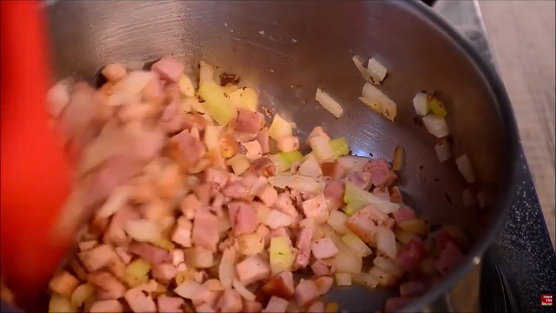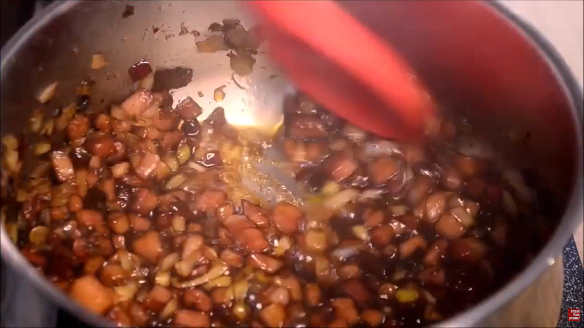 • Add the chopped onion and the cognac, and cook over low heat, stirring well until the fat loosens from the bottom of the pan.