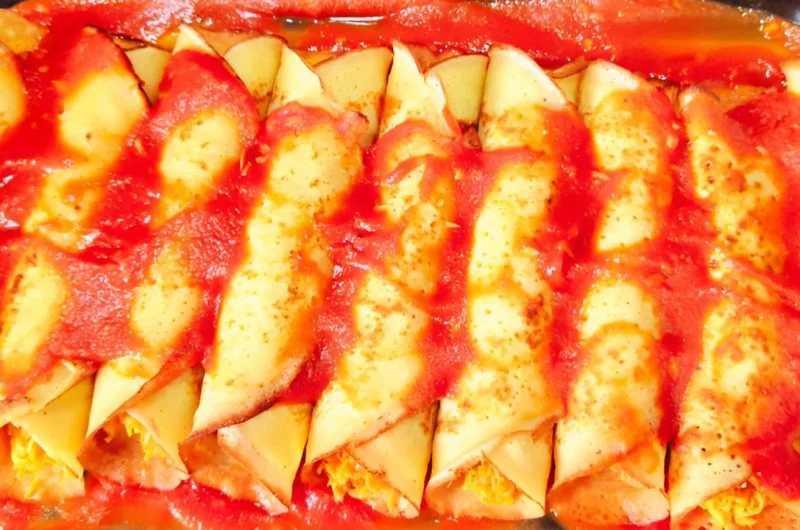 Repeat the process until you finish all the dough. - To assemble the pancakes, place a portion of the chicken filling in the center of each pancake and fold the edges to form an envelope.