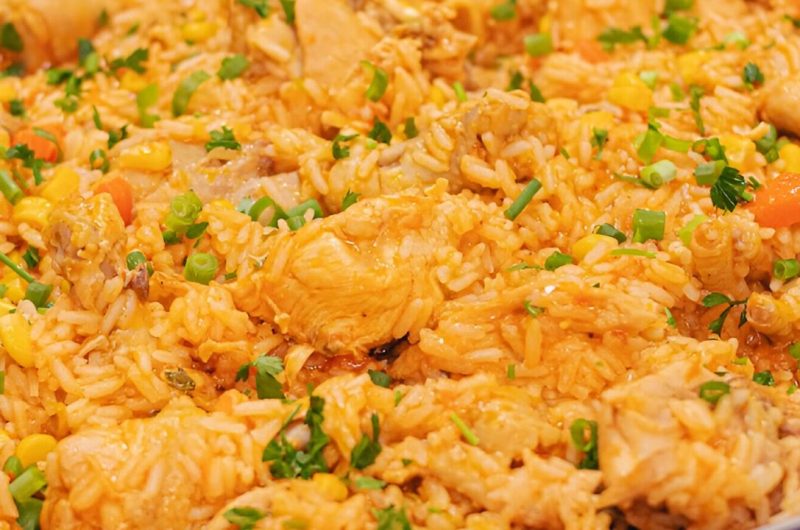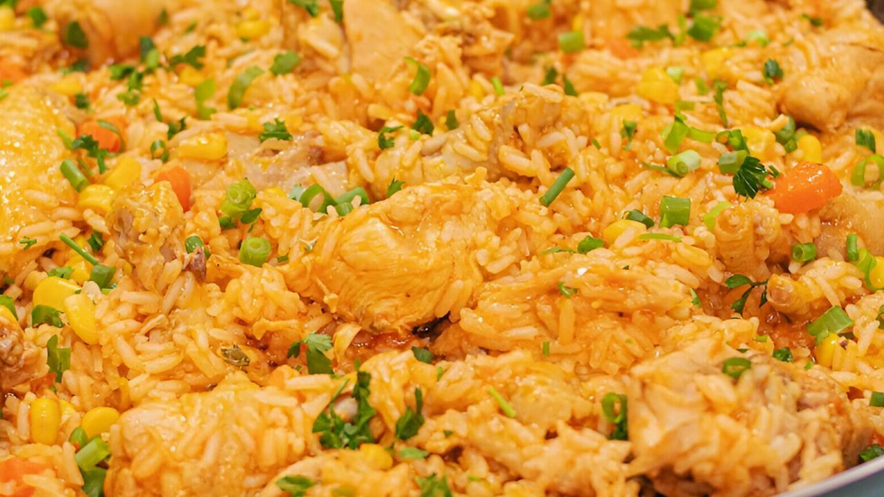 - Return the chicken to the pan, mixing it with the rice and vegetables.