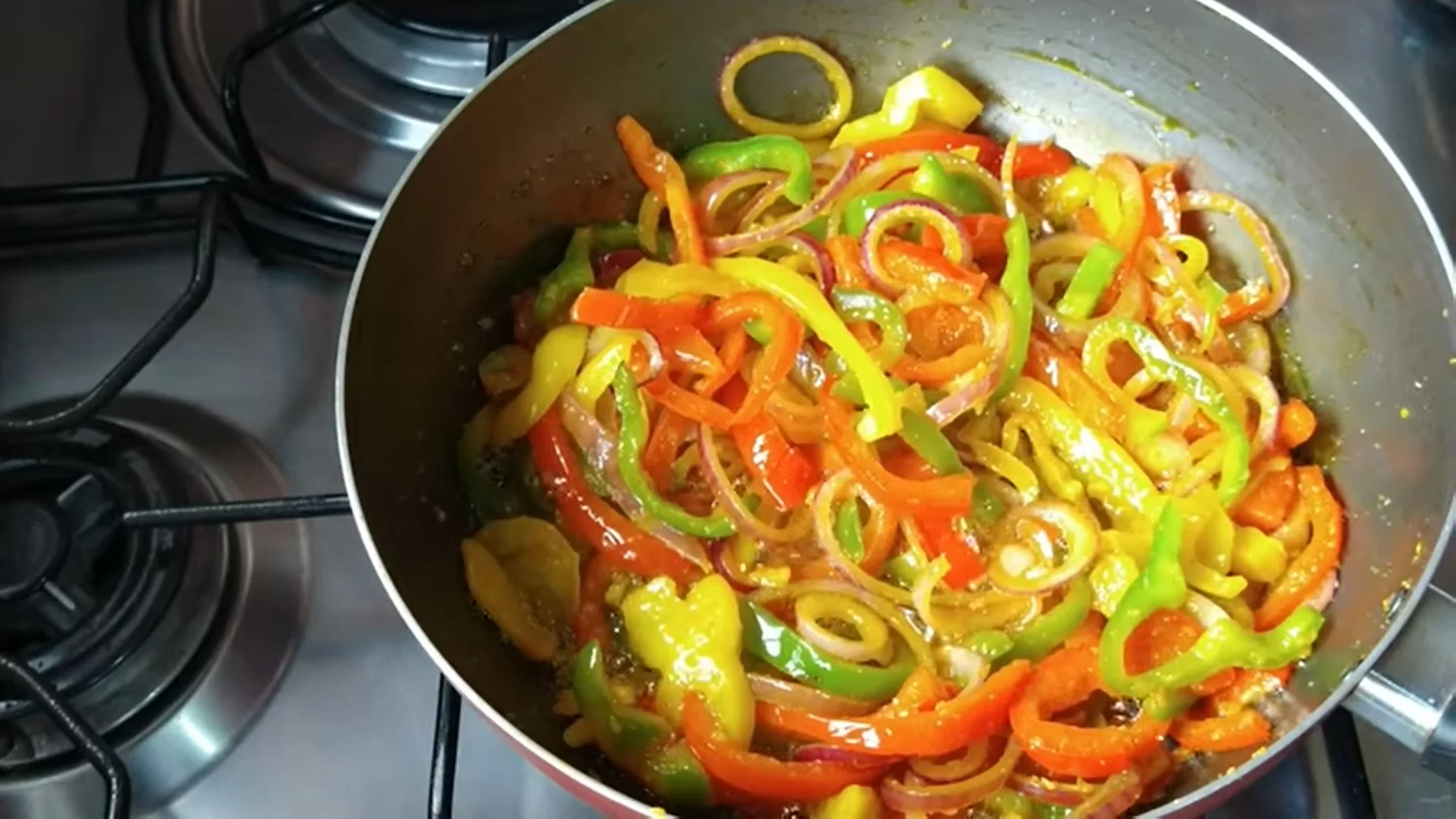 Add the paprika and mix, then add the peppers in strips, the onion cut into slices and sauté until wilted, stirring well.