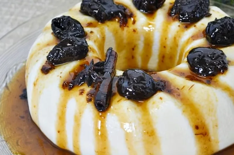 Book and wait for the syrup to cool down. - Unmold the delicacy onto a platter or plate, finish by placing the syrup with the prunes on top of the dessert and the delicacy is ready to serve.
