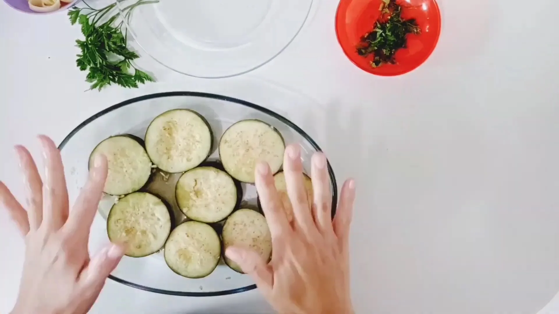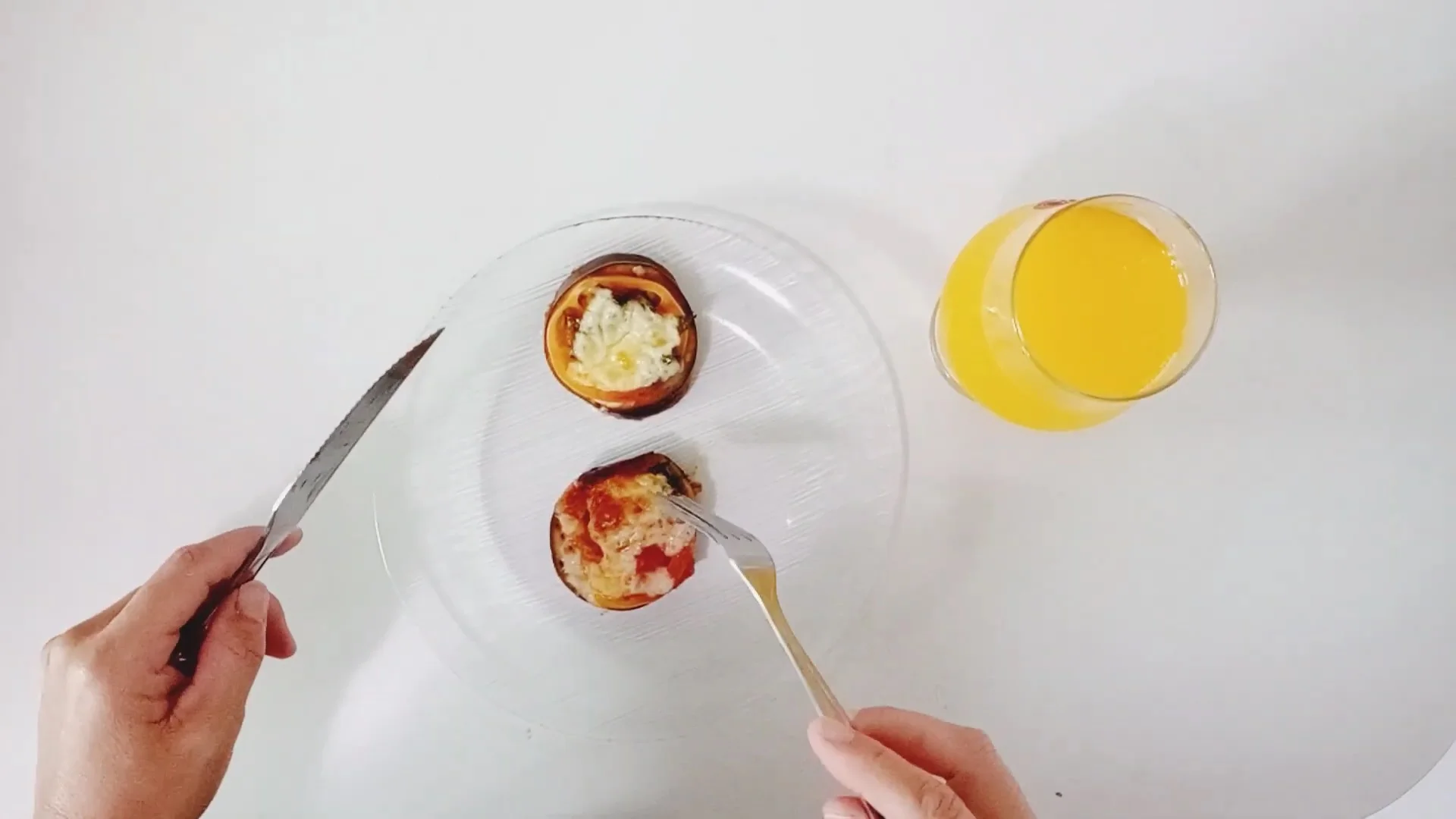 - Cut the tomato into slices and arrange them over the eggplant slices.Â