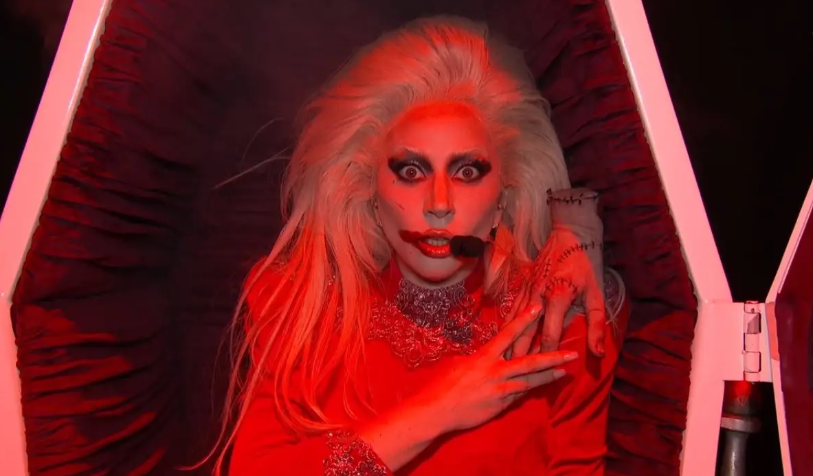 In the transition from this theme to a dance among young people dressed as Merlina, Ortega appeared on stage to sit at a table full of cobwebs and beheaded heads as part of the night menu. This little moment allowed Gaga a new change of costumes to culminate his medley with the hit of the moment, Abracadabra, wearing a red velvet dress.
