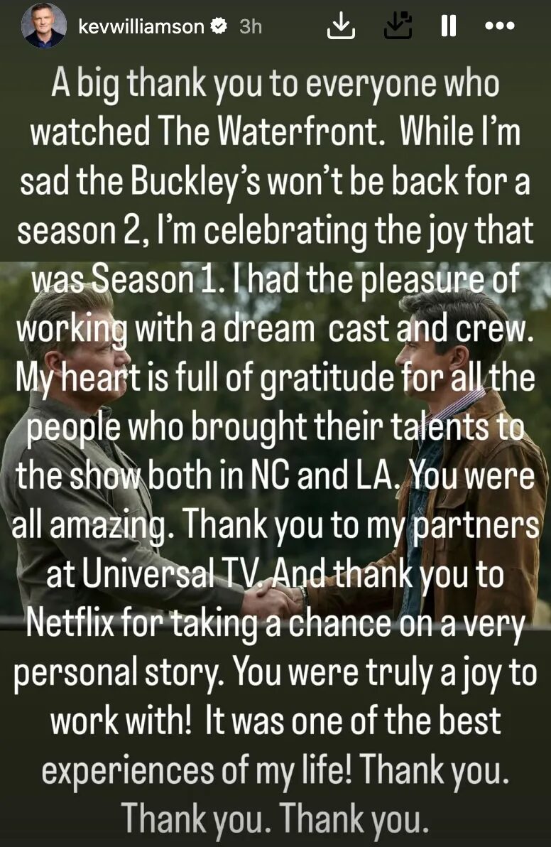 “Thank you very much to all who saw The Waterfront. Although I am sad that Buckley will not return to the second season, I celebrate the joy that the first season gave me. It was one of the best experiences of my life! “