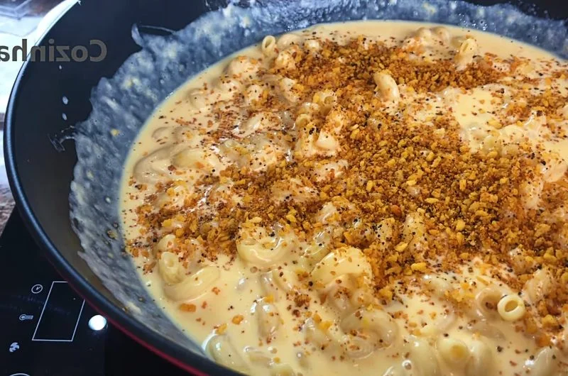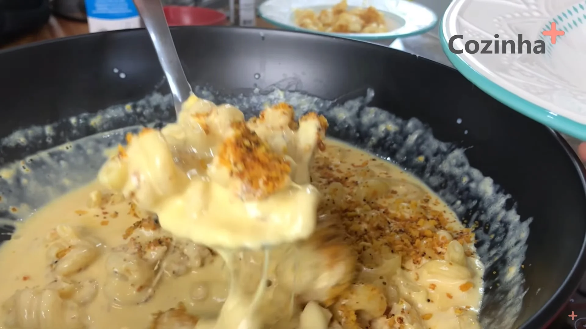Let it cook in milk until al dente. - Add the mozzarella and cheddar cheeses, mix well while cooking until completely melted, cover with the farofinha and the macaroni and cheese is ready.