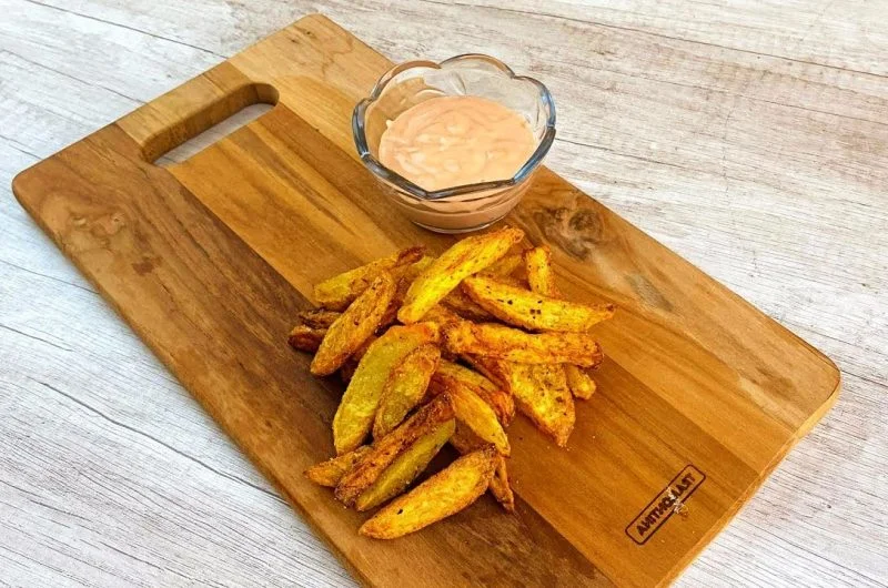 Serve the rustic fried potatoes with the pink sauce and bon appétit.