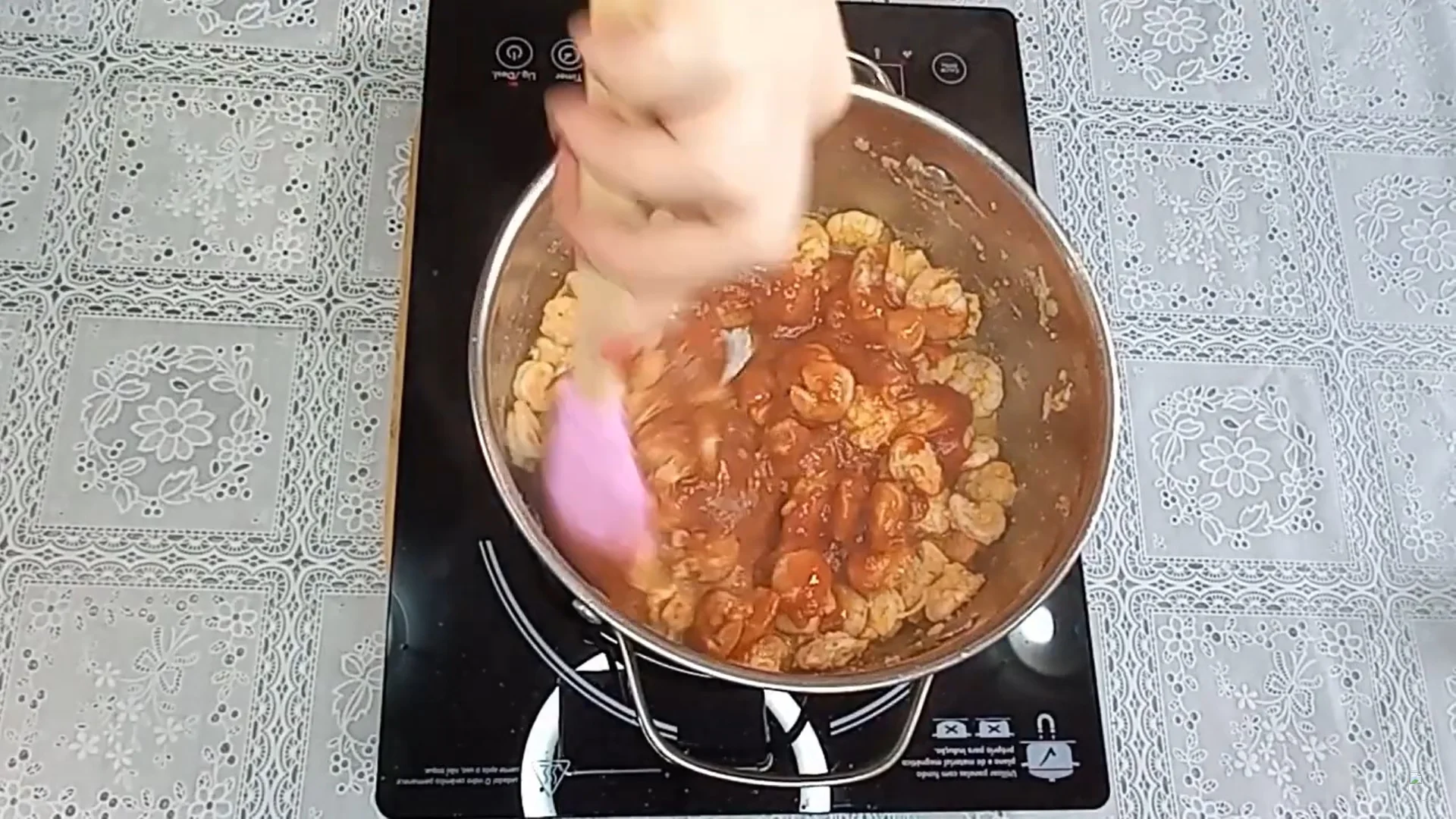 - After the shrimp are almost dry add the ketchup, tomato sauce and mix well.