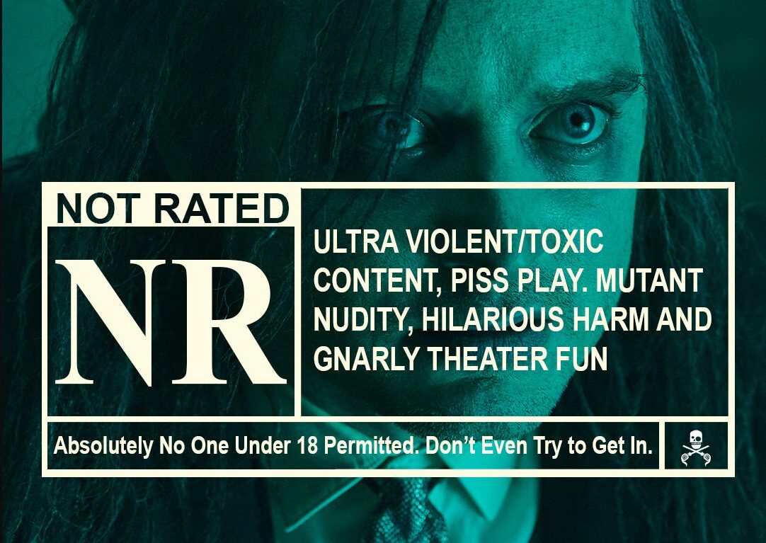 “Ultra violent/toxic content, pissing games. Mutant nudity, hilarious damage and brutal theatrical fun.”